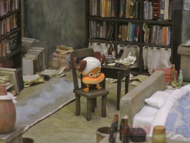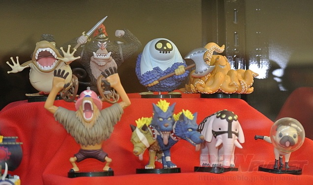 可動・差し替えフィギュアシリーズがワンピースプライズに登場。ラインナップはドラム島編回想のチョッパー、ヒルルク、くれはで、差し替えパーツによっていくつものシーンが再現出来るようです。会場ではこのフィギュアを使ったシーン再現映像(一部、画像中の展示写真)が流れていたらしく、本気を出せばストップモーション・アニメも作れることでしょう。誰か作ってくださいw