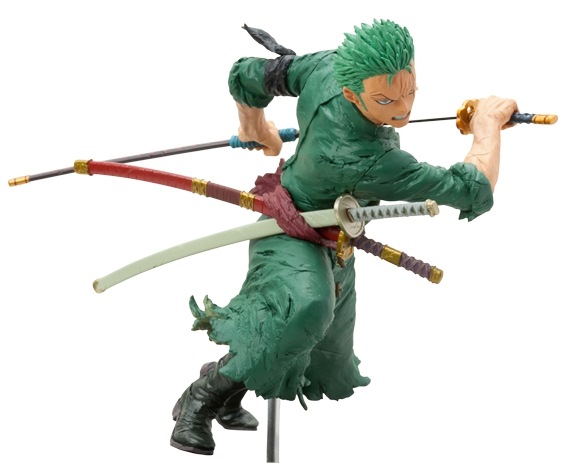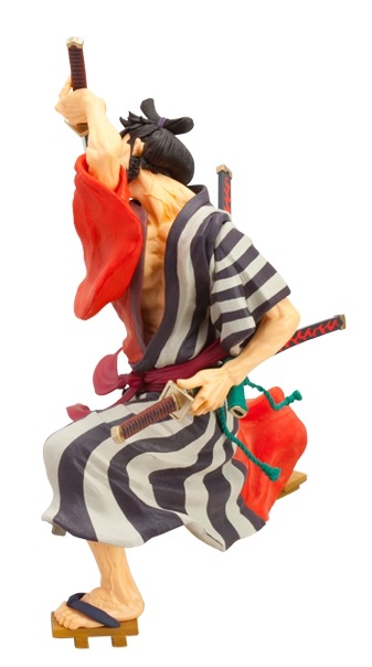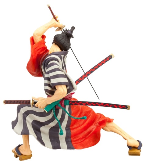 ポージングは居合い斬りということなんでしょうか。ただ、踏み込んだ右足は浮いており、走り出そうとしているには左足が残りすぎていて、どっちつかずでちぐはぐです。着物で剣士だとやはり、錦えもんと比べてしまうわけですが、単色塗装において緑一色のゾロの着物はかなり不利に見えます。