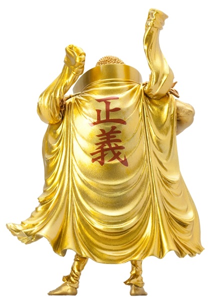 一色というわけではなく、肌、髪の毛、服はそれぞれ明暗の調子を変えて塗装。「正義」の文字以外はなぜかコートの裏地だけが茶色です。正面から見て成立している金剛力士像風の立ち姿と流れるような服皺の造形は、