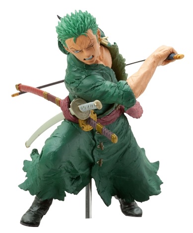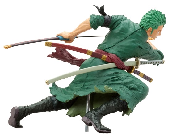 ▼「勢い重視」というオリジナルのポージングはまさに前に駆け出す勢い。台座に固定すると勢い余って前のめりに倒れてしまいそうな勢いで、おそらく製品化の際には、造形王SPゾロの時と同様な補助パーツが付属すると予想されます。ただ、そうなると駆け出す瞬間の”動”が失われてしまう心配があり、さらに補助パーツの色がまた黒だと考えると・・・製品化が思いやられますが、原型は原型なので。。髪の毛の造形は細かく、服はダメージ造形。顔は鬼気迫る表情となっており、新世界編ではまだ描かれていない”本気”のゾロが再現されています。ただし、「汚し塗装」が禁止されているルールの中でこのシチュエーションの選択は分が悪そうです。また、ゾロが左手に鞘を持って刀を抜く姿・シチュエーションに違和感があり、左手は腰に差してある刀の柄を持っていた方が想像が湧くような気がします。