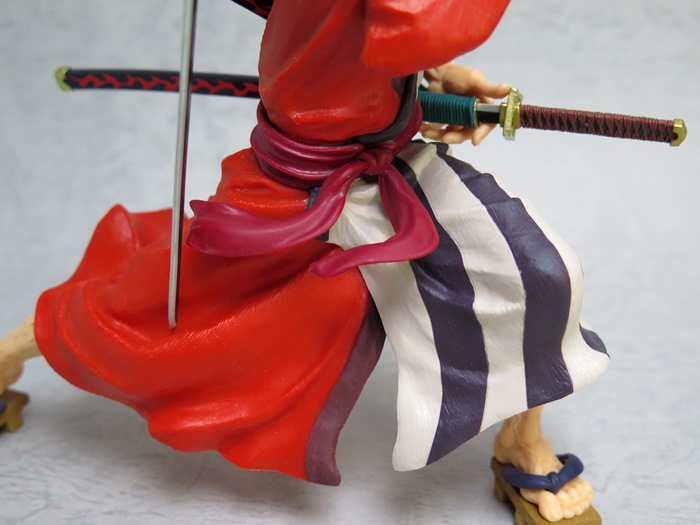 。もう少し鋭利だった方が良かったです。また、個体差なのか刀の先が着物に刺さりかけています(パッケージのサンプルはもう少し浮いているのですが・・・)。刀は手のひらでダボ接着されています。というか、親指と人差し指で軽く持ったようなこの握りで攻撃を受けることが出来るのだろうかと。