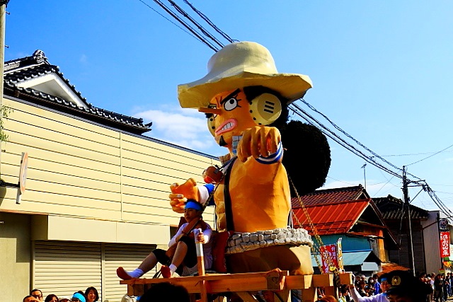 毎年、針道若連連合会の7つの若連が山車(主にキャラクターもの)を製作しますが、去年に続き今年も7台中3台のワンピースキャラクターが揃いました。白ひげ、ウソップ、サボ。