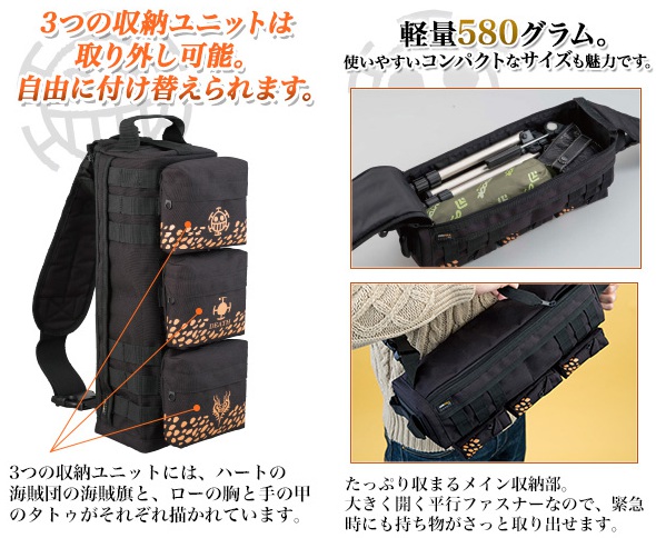 米軍特殊部隊の装備(Go Bag)を使いやすいデイリーユースのサイズに改造。軽くて強靭な高機能素材”コーデュラ®ナイロン”を採用するなど、危険な局面をくぐり抜けるための工夫が様々に凝らされました。何より注目は、オペオペの実の能力に想を得た衝撃の”シャンブルズ仕様”!! まるで空間を自在に支配執刀するように、ローのシンボルが描かれた3つの収納ユニットを自由につけ替えてお楽しみいただけます。