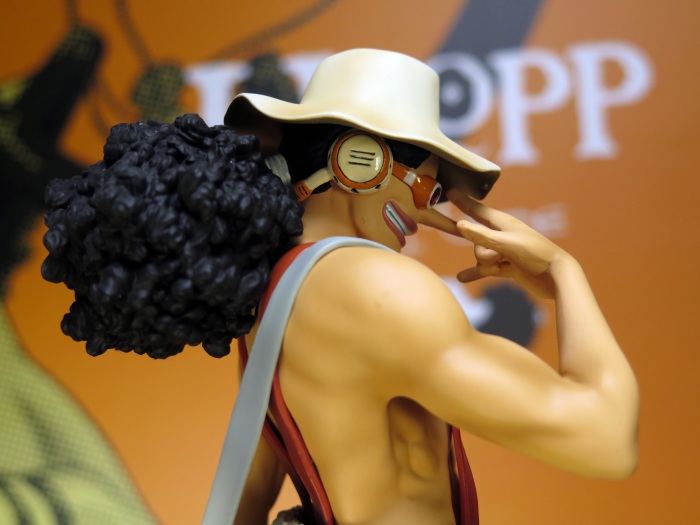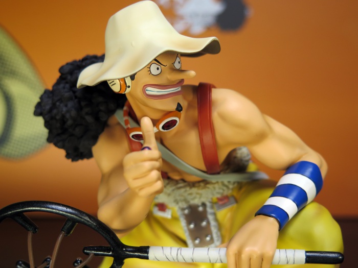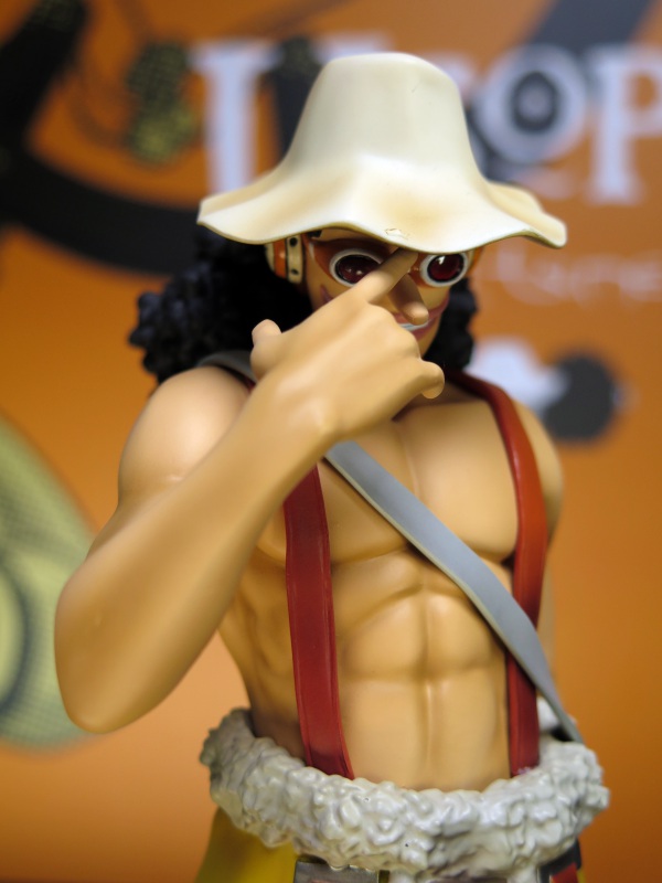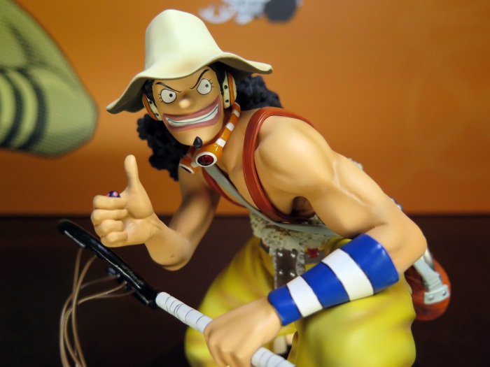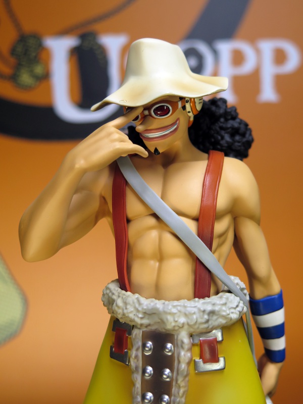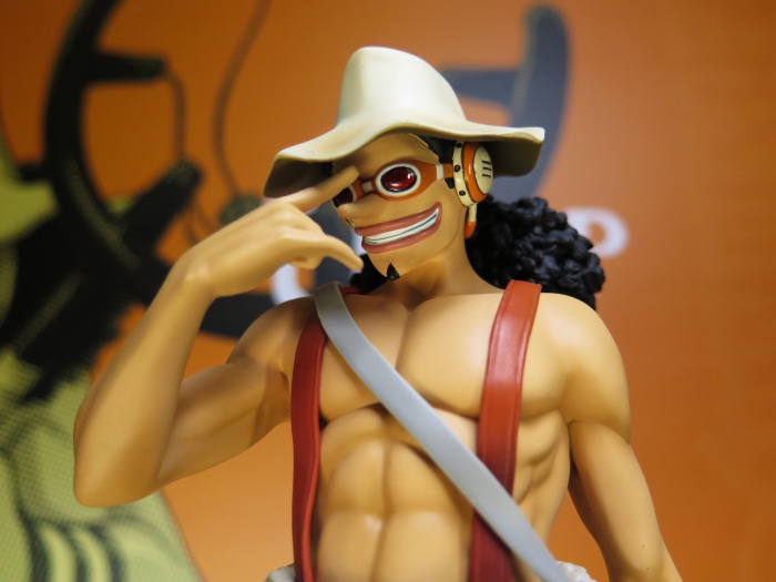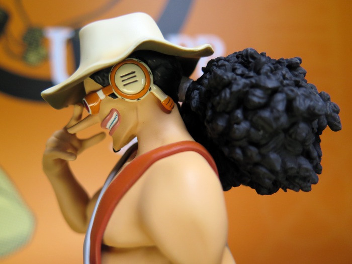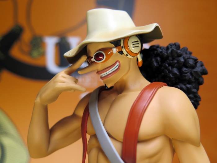 こちらのバージョンはゴーグルなしです。厳密に言うと、輪郭の作りが違い、目が離れていて顔はそれほど似ていない気がするのですが、大きな口に長い鼻、眉毛の全体的なバランスは良く、完成度は高いように感じます。実際より眉毛がやたらと太くなる傾向にある既存のウソップフィギュアと比べると眉毛は及第点でしょう。なんか色気が出てます。