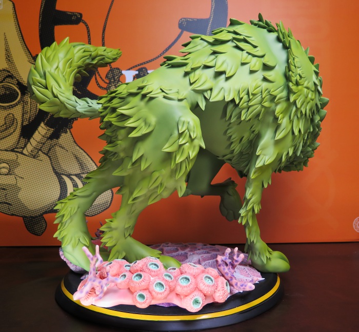 台座との固定はやっぱり足裏にある金属ダボを挿しているだけ。左前足は浮いており、重心は偏っている気がしますが、台座もかなり重いため倒れる心配はなさそうです(たぶん)。それよりも持ち上げる際、毛並み(葉並み?)のトゲトゲが折れてしまわないか冷や冷やしました。いつまにか1箇所折れてたんですが・・・(汗