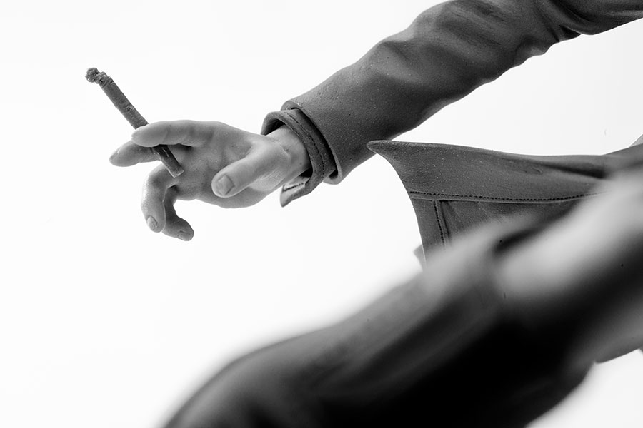 KOZO:決めポーズ画像でわかるように、右ひざ、手、タバコ、ネクタイ、顔と、構図としては気持ちの良い位置に配置されており、シャツとジャケットの奥行き感やネクタイ、髪の毛の浮遊感で動作の中であるポーズを強調し、うまく表現されていました。
