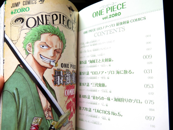 カバー無しのペーパーブックです。表紙をめくったところに作者欄はなく、いきなり目次が入っています。内容はデータブック(ONE PIECE RED)風のゾロの特集記事に加えて、ゾロが活躍した原作エピソード5本が再録。さらに、ゾログッズの懸賞企画も掲載されています。