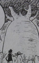 尾田:お気づきの通りです。ページが足りずにまぁ説明する程、重要じゃないかとすっ飛ばしましたが、映画のお話を作った時に、ダフトグリーンという樹を出したんですよ。これは動物の嫌う臭い(毒)を発する樹で、動物達は決してよって来ないので、ここでも使いました。でも全く同じ種類じゃなく、同系・毒なしの設定です。