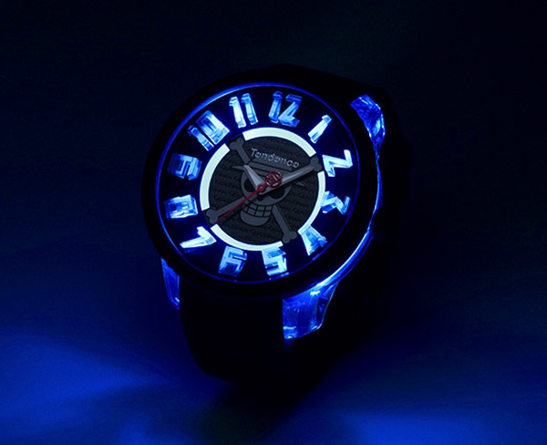 また、3時位置の「リューズ」をプッシュすることで内蔵されたLEDが7色の異なるカラーに光り、昼と夜で違う印象を楽しむことができます。カラーライトのセレクトは、「リューズ」を3秒以上長押しして決めることができ、レインボーに光るジャンピング機能もっています。
