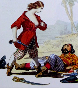 この二人の女海賊は男装をして男として振る舞っており、仲間の船乗りたちも二人が女だとは知らず、戦闘では男勝りに大胆不敵に戦ったと伝えられています。