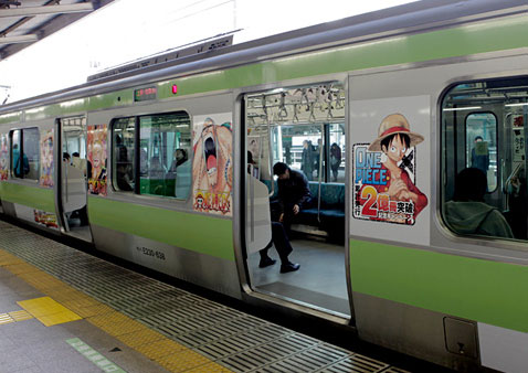 尾田栄一郎さんのマンガ「ONE PIECE(ワンピース)」のラッピング電車が17日から、東京・山手線にお目見えした。同線を走る電車1編成(11両)の外観デザインから車内の中づり広告、モニターまで全て「ONE PIECE」一色にした。3月1日までの期間限定で運行される。