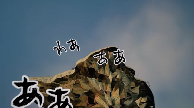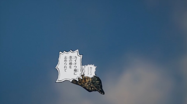 カイドウに敗れ、浮上した鬼ヶ島からルフィが落下するシーンを再現した、こちらの演出。ジャンプフェスタオンライン会場(ジェンフェス島)を鬼ヶ島に見立てているわけですが、ジャンプフェスタオンライン会場は島の端から足を踏み外すと落下する演出があり、アプリ上では自動的に会場に戻されるのですが、これを経験した人にとっては結構、深みのある演出になっています。