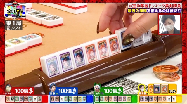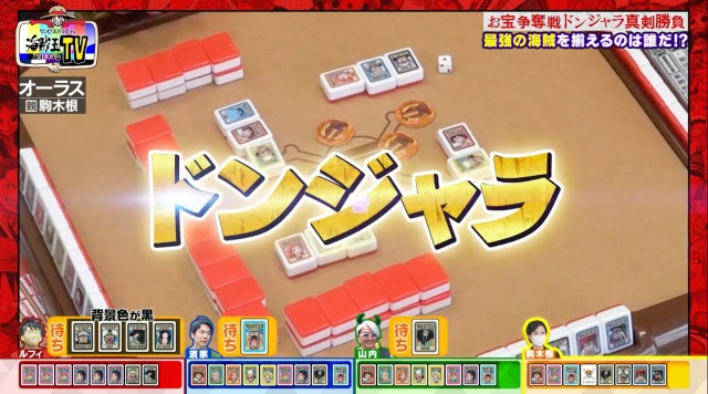 オーラスは駒木根さん以外がトリプルリーチで誰がアガっても番組側が勝利という状況。作家のルフィがゴミ役で多面待ちしている中、かまいたちの二人は麦わらの一味を揃える特殊役を手作りして、最後は濱家さんがフィニッシュ。