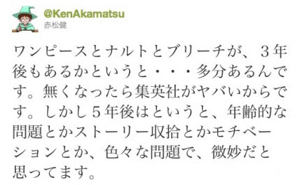 「ワンピースとナルトとブリーチが、3年後もあるかというと・・・多分あるんです。無くなったら集英社がヤバいからです。しかし5年後はというと、年齢的な問題とかストーリー収拾とかモチベーションとか、色々な問題で、微妙だと思ってます。」