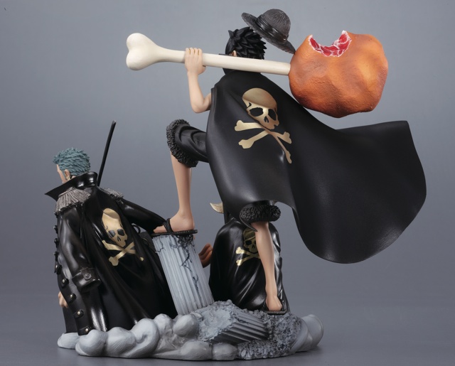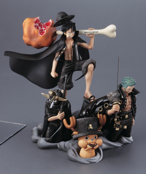コラボフィギュアでは、これに「mastermind JAPAN」の世界観を大胆に落とし込み、着用ウェアをすべてブランドカラーの「黒」で統一した。マントをなびかせワイルドな装いのルフィが持つ大きな肉の骨にはブランドネーム、ルフィやゾロ、そげキングのバックスタイルやチョッパーの帽子には「mastermind JAPAN」を象徴する「スカル」が印されており、ブランドロゴが掲げる「ラブ&ピース」を背負った新たな"麦わら一味"へと姿を変えている。