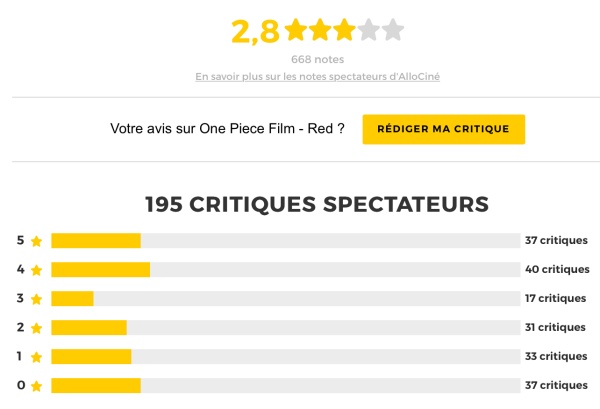 フランスの大手映画レビューサイト「AlloCiné」のユーザー評価も同じような具合になっています。