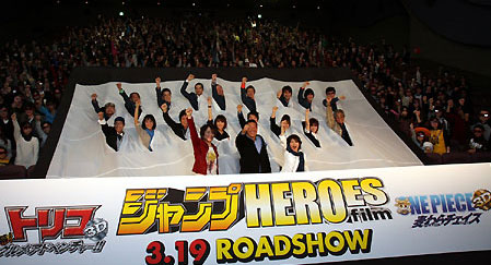 完成披露試写会が行われ、『ワンピース』のゲスト声優を務めたお笑い芸人の“ぐっさん”こと山口智充、主題歌と劇中歌を提供した東京スカパラダイスオーケストラ、そして『ワンピース』レギュラー声優陣(田中真弓、中井和哉、岡村明美、平田広明、大谷育江、山口由里子、矢尾一樹、チョー)、『トリコ』声優の置鮎龍太郎、朴路美ら総勢20名が登壇した。
