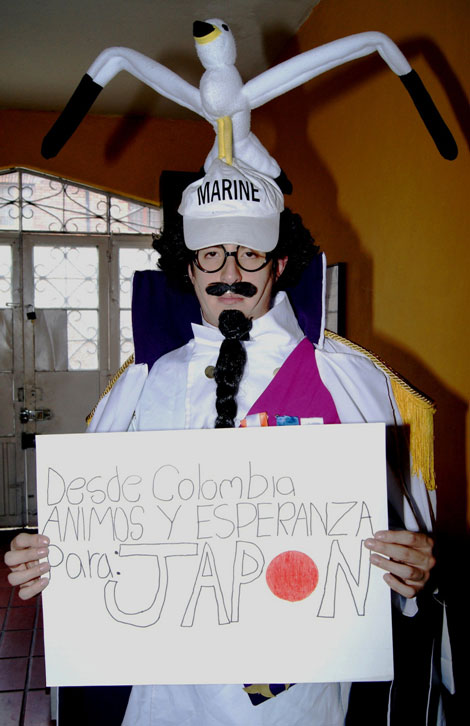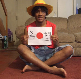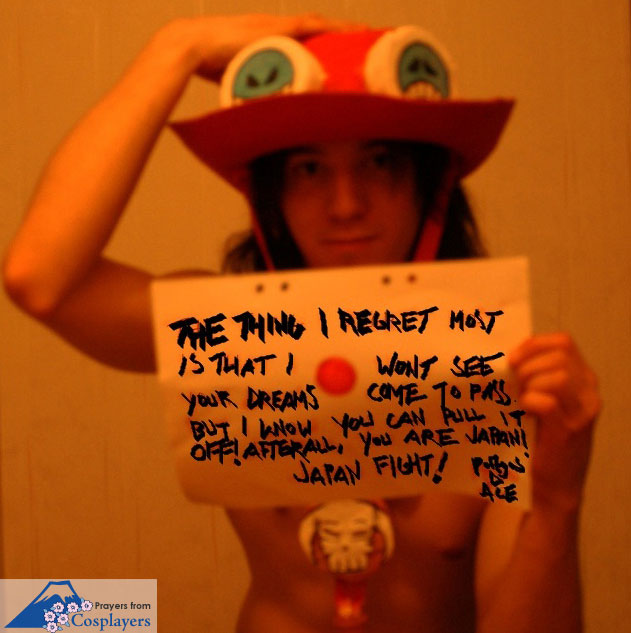 ONE PIECE(ワンピース)」の「ルフィ」や「初音ミク」などの日本のキャラクターのコスプレをして、日の丸と「HOPE」などのメッセージが描かれたボードを掲げた画像を公開し、エールを送っている。