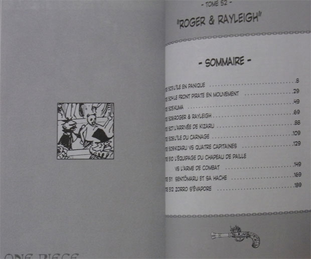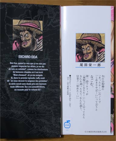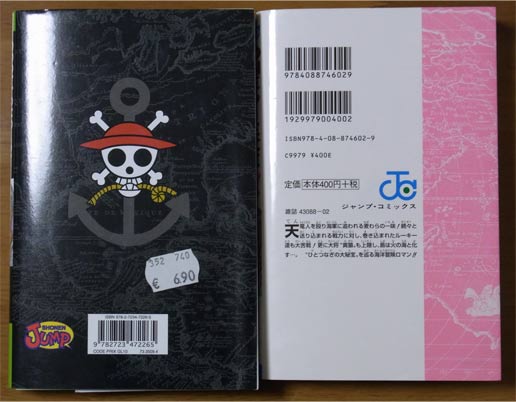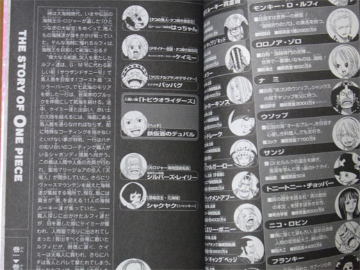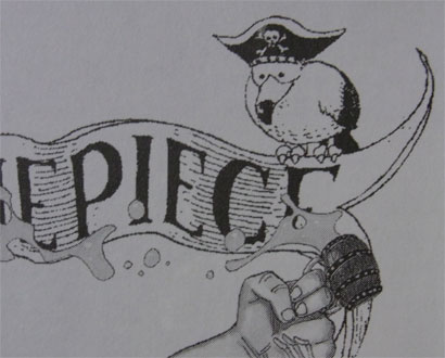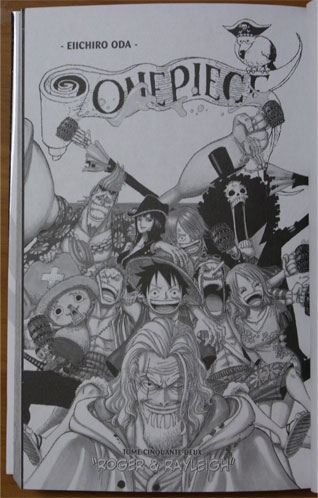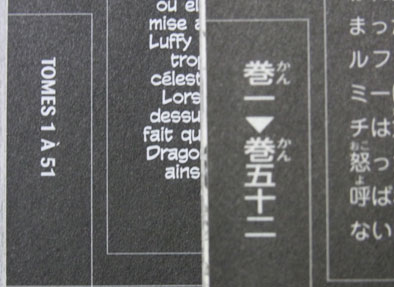 タイトルロゴのアレンジ。ルフィのシルエットになっている「I」は使用せず、「O」の中の麦わらの骸骨は外に出て、フォントも異なる。配色はグラデーションもなく黒になっており、全体的に上側に押し上げられているため、JCコミックスでは隠れていた表紙絵の部分が見える。