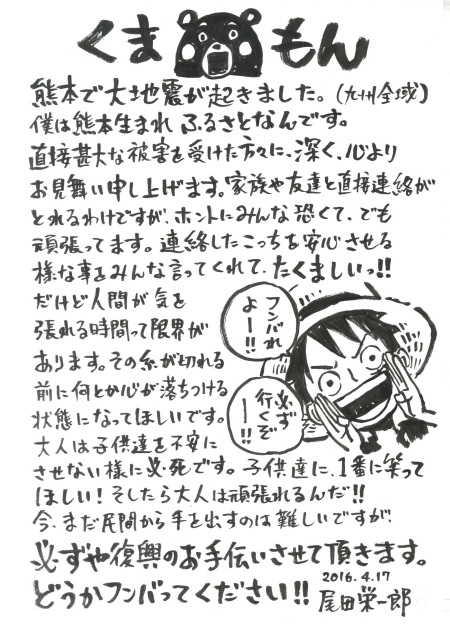2016年4月に発生した熊本地震で甚大な被害を受けた熊本の復興支援に、熊本出身の尾田栄一郎と麦わらの一味が立ち上がった!! 『ONE PIECE』熊本復興プロジェクトは全部で5つ!熊本復興のために尾田栄一郎が描きおろしたルフィたちが大活躍します!! 麦わらの一味と一緒に、熊本を元気にする復興プロジェクトを盛り上げましょう!