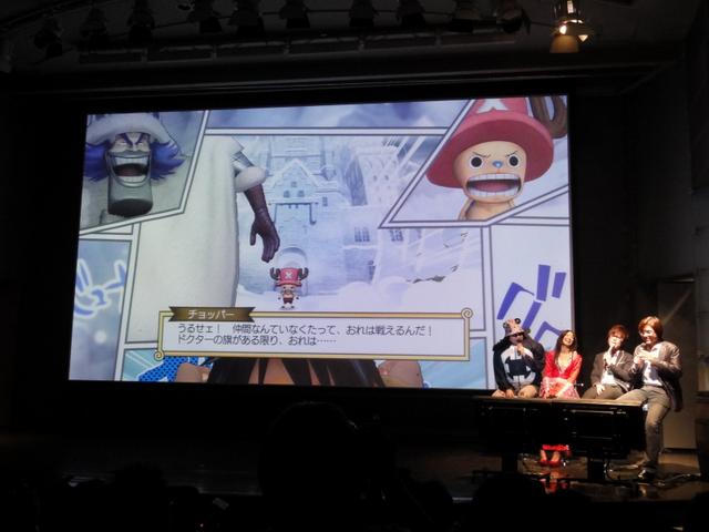 芹那が登場。好きなキャラクターやシーンなど、両者が事前に答えたアンケート結果を元に、それがゲームではどのように表現されているのかが、実機デモで紹介された。最初の質問は、好きなキャラクターについてで、藤森は“サンジ”、芹那は“トニートニー・チョッパー”と回答。デモプレイではサンジのアクションが公開され、遊んだ藤森は「爽快だねこりゃ!」、「操作性がよくて、技も忠実!」とゲーム性の高さと、キャラクターの再現度を大絶賛。一方の芹那は、大好きなチョッパーが活躍する“冬島”のエピソードをプレイ。モニターに映るチョッパーの姿に「つまみ出したくなりました!」と魅了され、ゲームプレイでも「必殺技がポンポンと出せて、気持ちよかったです。もっともっと遊びたい」とすっかり引き込まれている様子だった。