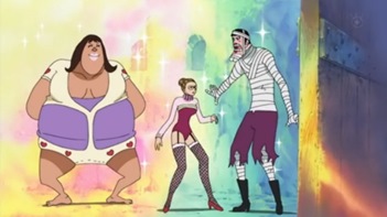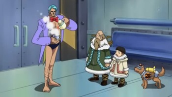 453 | 仲間達の行方 空島リポートと改造動物 | ※扉絵連載「ナミのウェザーリポート」「フランキーの今週のおれダメだ」 <改変> ・(Ep.418の続き)紳士のフランキーを元に戻したいキットンは、野生を取り戻させるために寝ているフランキーをメカアニマルの森に放置し、メカアニマルに襲われたフランキーは怒りで紅茶が沸騰し、蒸気のエネルギーで元に戻る。コーラを作る機械を探して、キットンはフランキーをベガパンクの家に案内する。 <補足> ・ウェザリアは研究費を稼ぐため天候の科学で商売をしている ・ベガパンクは作ったメカアニマルを放置してバルジモアを出て行った | 扉絵 (548-549話 555-556話) |
