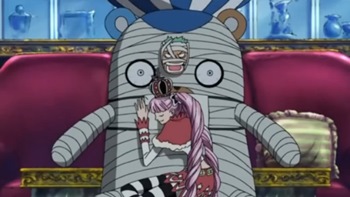 421 | 仲間達の行方 ネガティブ王女と悪魔王 | <改変> ・軍艦に帆が張られている。※Ep.418から毎回密航中のルフィの様子を描写したため、おそらく凪の帯を抜けた設定になっている ・ハンコックが軍艦の部屋にハートで囲った自分とルフィの名をペンで書く ・ゾロが目覚めたのはペローナに保護されてから2日目の朝 <original> ・ナミとロビンを恋敵と勘違いしたハンコックの妄想 ・ペローナは目覚めたゾロにクマシーの格好を無理やりさせて寂しさを紛らわそうとする。ゾロが城から出て行こうとすると、一人になるのが寂しくてゾロの行く手を妨害する。 | 524話 |