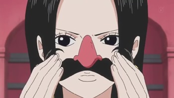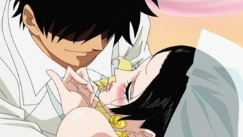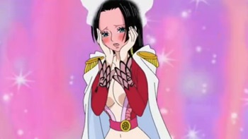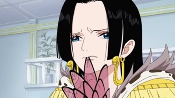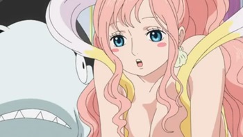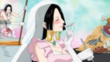 417 | 恋はハリケーン! メロメロハンコック | <補足> ・軍艦に乗り込んだハンコック(+ルフィ)の様子。蛇姫「歩きにくいのでもう少し上へ」ルフィ「こうか?」蛇姫「はぅっ///…ぐっ///…」 | 522-523話 |