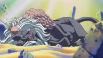 448 | マゼランを止めろ! イワさん奥義炸裂 | <original> ・Lv.2猛獣地獄のサソリ(?)の怪物 <補足> ・イワンコフと対マゼラン時間稼ぎの様子 | 545話 |