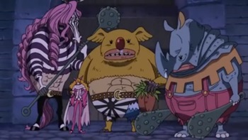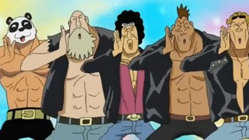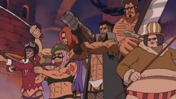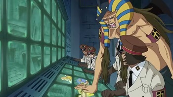 445 | 危険な出会い! 黒ひげと雨のシリュウ | <original> ・「ニューカマー武闘派六人衆」(獄卒獣の足止めを申し出たが歯が立たず敗れる) ・バギーとMr.3の連携技"ド派手トンカチ"(キャンドルロックを纏った手を射出) ・ハンニャバルの腹踊り(腹にマゼランの顔) <補足> ・マゼランの毒の壁を通過するため奮闘するバギー達の様子 ・イワンコフとサディちゃんの戦闘シーン ・エンポリオ・女ホルモンを注入したイワンコフの体はしなやかで柔らかくなり、どんな衝撃も吸収する。 | 542-543話 |