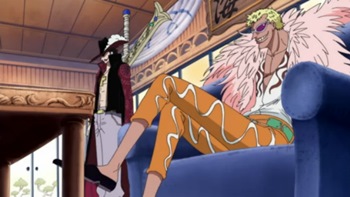 510 | サンジの受難 王国へと帰還した女王! | <original> ・別れの時、チョッパーは鳥のヒナから巨大な綿アメをもらう。 ・別れの時、ロビンはソランから似顔絵をもらう。 <補足> ・レイリー達が奪った軍艦でマリンフォードの正義の門を通過する様子 ・イワンコフがカマバッカ王国に帰還した直後の様子。サンジは女イワンコフに惚れる。 ・イワンコフとサンジの一騎打ちシーン | 591話 593話 |
