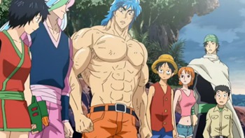 492 | 最強タッグ! 奮闘、ルフィとトリコ! | <original>「トリコ×ワンピース コラボ特別編」 ・アニメ「トリコ」放送開始記念コラボ後編(※前編はアニメ「トリコ」の第1話)。ルフィ達は食料調達のため不思議な食材で溢れる「ハングリラ島」に上陸。そこで美食屋トリコ達と出会う。宴の最中、小松とナミが猛獣「ココアラ」の群れに攫われてしまい、ルフィらは二人の救出に向かう。 ・ルフィとトリコの連携技"ゴムゴムの釘パンチ"(ルフィを足場にゴムの反動で飛び出したトリコが"釘パンチ"を打ち込む) | - |
