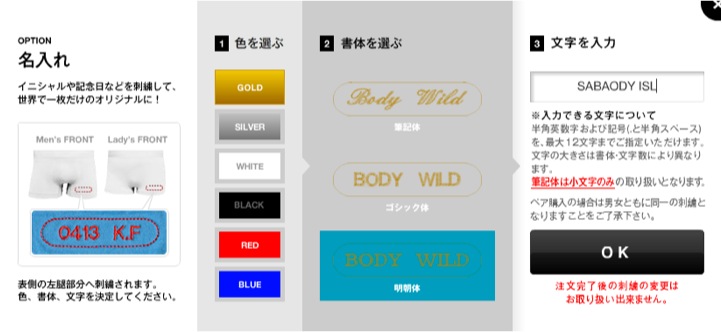 刺繍は色(6種類)、書体(筆記体、ゴシック体、明朝体)を選び、半角英数字で最大12文字までの文字を入力します。※ペア購入の場合は同一の刺繍になります。