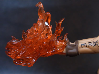 メラメラのエフェクトがクリアパーツで再現。よく見ると他の差し替え腕パーツと同じポージングの拳が造形されています。