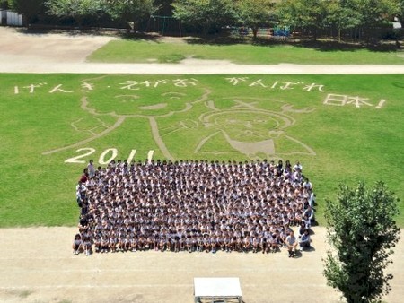 しばふアート2011」の前に全校児童516人が集まり、記念撮影を行った。