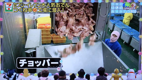 炭火焼つくね串の中国工場にカメラが潜入したシーンより。