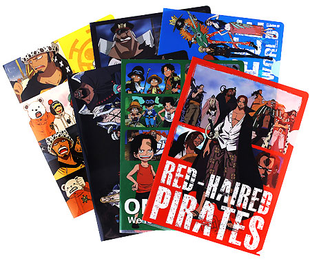 (B5ノート2種、麦わら海賊マークを箔押加工したケース付メモ、3色ボールペン、ルフィのギガントボールペン、海賊旗ステッカー、チョパーのクリップトレイ、麦わら海賊旗をデザインしたB6リングノート)