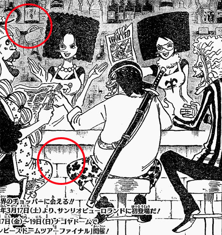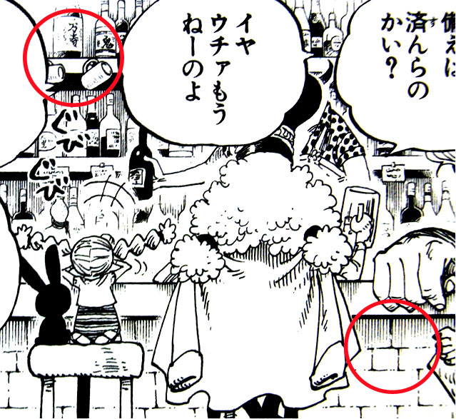 リスキー兄弟が座っています。この3人にもデザインの変更点はないようです。スリラーバーク編は不吉な終わり方をしましたが、無事、”魔の三角地帯”を抜けたようですね。ニュース・クーを話の種に麦わらの一味について話が盛り上がっているようです。