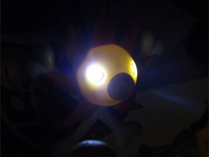 露光時間や光源を変えて何パターンか撮ってみたのですが、実際の光り方と同じように写すのはできませんでした。コンデジの限界か、テクニックの問題か・・・。実際の光り方は一番下の画像が一番近いです。