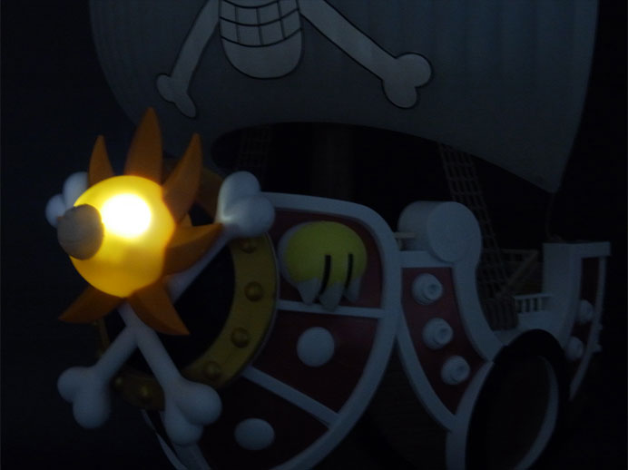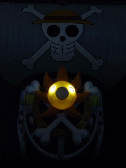 コレクションケースのスペースの都合でサニー号の後ろ半分をカット、海賊旗は上の空間が無駄になるので取り外しています。