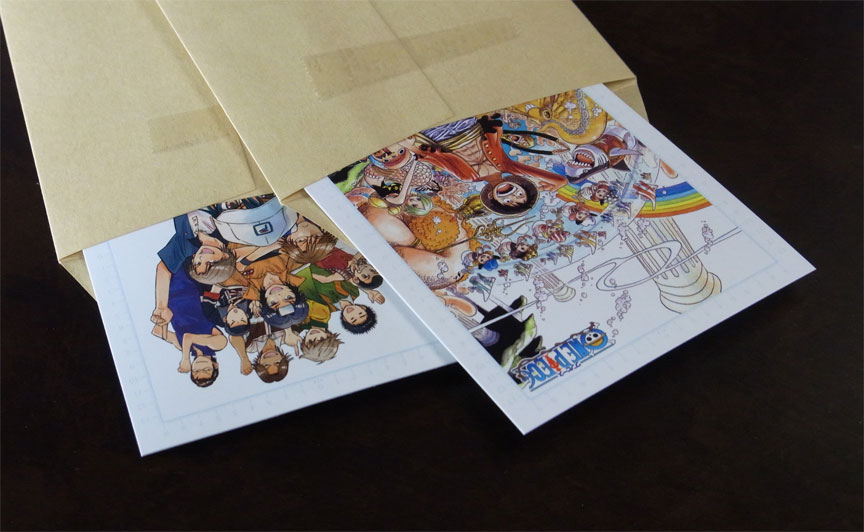 原稿封筒風 袋入りカラーシート」は全40種でワンピ絵柄は3種ですが、中身は選べません。1枚でもワンピ絵柄を引く確率は3/40=7.5%。