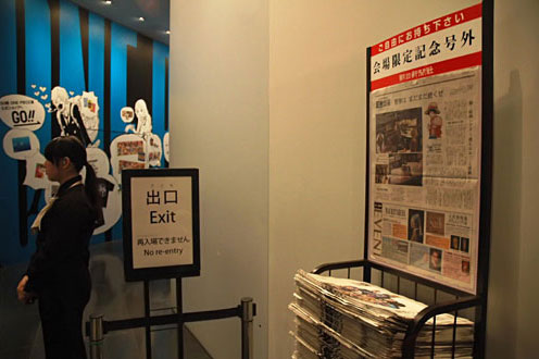 続く等身大フィギュアコーナーは、とりわけナミさんの後ろ姿がタイヘンなことに。こんなにローライズだったっけ? そして尾田さんの机を再現した最後の原画コーナーを抜けると、出口には私の書いた尾田さんインタビューの載っている記念号外がどっさり積まれていますのでご鑑賞の記念にぜひどうぞ(これが最後の自慢)。