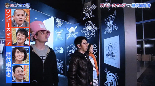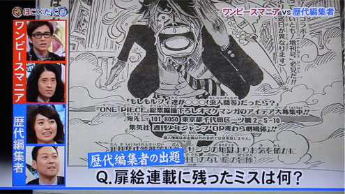 ONE PIECE歴代担当編集の知識対決です。ワンピをこよなく愛するマニアの知識が上なのか、はたまたワンピに最も近くで携わってきた担当編集の知識が上なのか。フジテレビで放送されるため、番組が事前にマニアを募集していた段階では番組構成はアニメよりなのかと思われましたが、蓋を開けてみれば決戦の会場はONE PIECE展で、対戦相手は歴代担当編集という具合に、アニメ色が一切ない原作ベースの番組となっています。