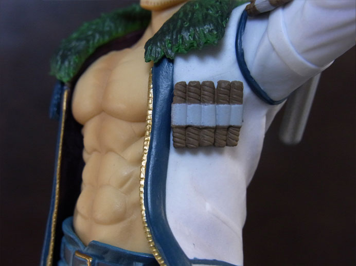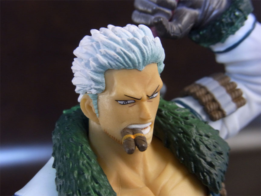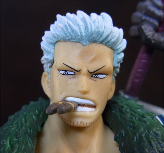 目線の先の向かって左斜め下から覗くと、特に似ています。眉間の皺、こめかみ、口の曲がり具合など細かなポイントをよく押さえて造形されており、キャラらしさが出ています。肌は薄く塗装されて、目、眉、目元の皺、ヒゲはプリント。