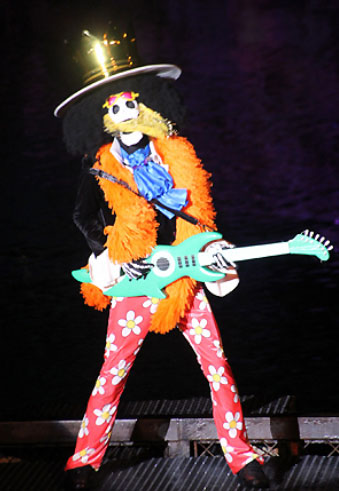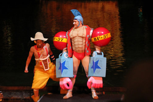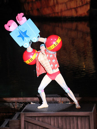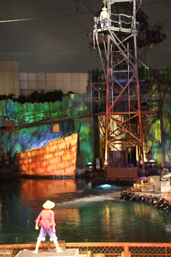 同ショーはアトラクション「ウォーターワールド」のセットを舞台にし、