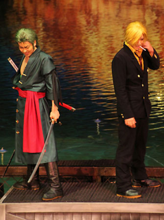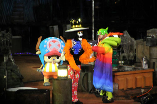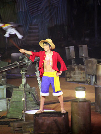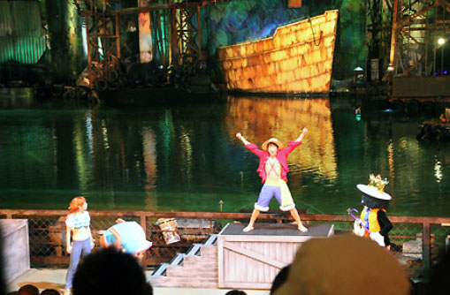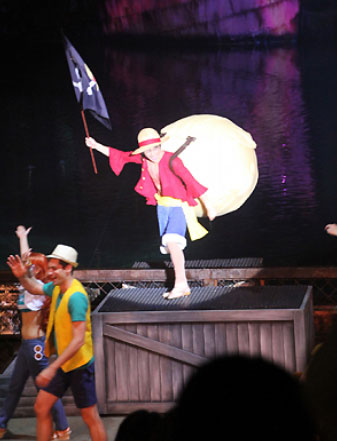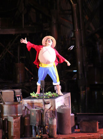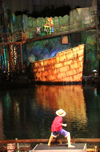 ワンピ声優陣の録音音声に合わせて役者たちが動く、言わば豪華なアクションヒーローショーです。ストーリーはショーオリジナル。セットを活かし、特殊効果を駆使したアクションが展開します。