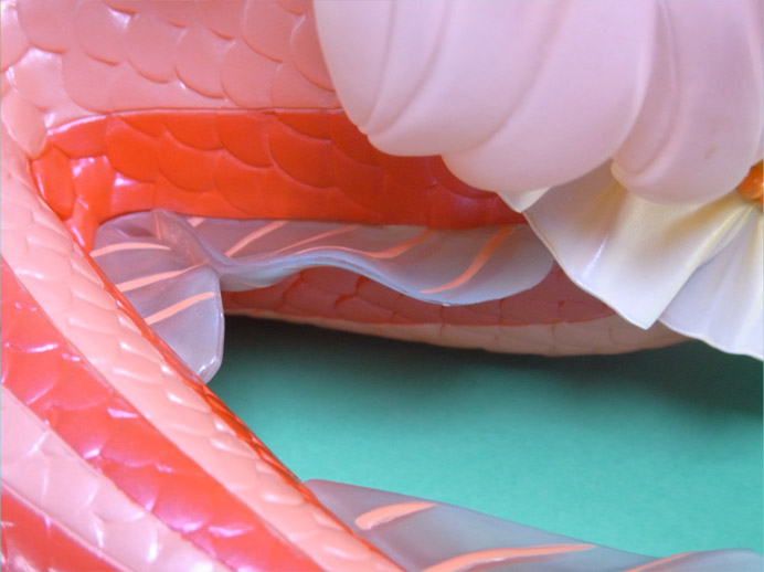 折れ曲がった後ろ辺りに大きなパーティションラインがありませんが、鱗の形に沿って波打ったつなぎ目になっており、目立たないような工夫がされています。
