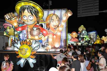 青森の「ねぶた」を模した絵ぶたは、幅と高さ約4メートル、奥行き約3メートルで、内部から電球で照らす構造。人気アニメ「ワンピース」、NHK大河ドラマ「平清盛」などを題材にした8基を、製作した住民グループなどが押して練り歩いた。太鼓やかねが打ち鳴らされる中、法被姿の踊り手が「ラッセーラー」と声を張り上げ乱舞した。