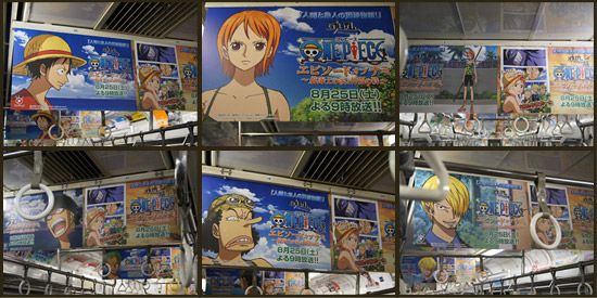 中央線の3線で、全ての中吊り広告がワンピースでジャックされた車両(各線1編成)が運行しています。