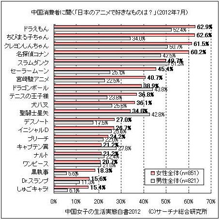 中国で行ったインターネット調査で、中国消費者に「日本のアニメで好きなものは?」と聞いたところ、男女の全体平均で「ドラえもん」が57.7%で最も多くなった。「70―80年代生まれの中国人は誰でも知っている。ドラえもんを通じて、“どら焼き”という和菓子があることを知った」(上海女子)という。